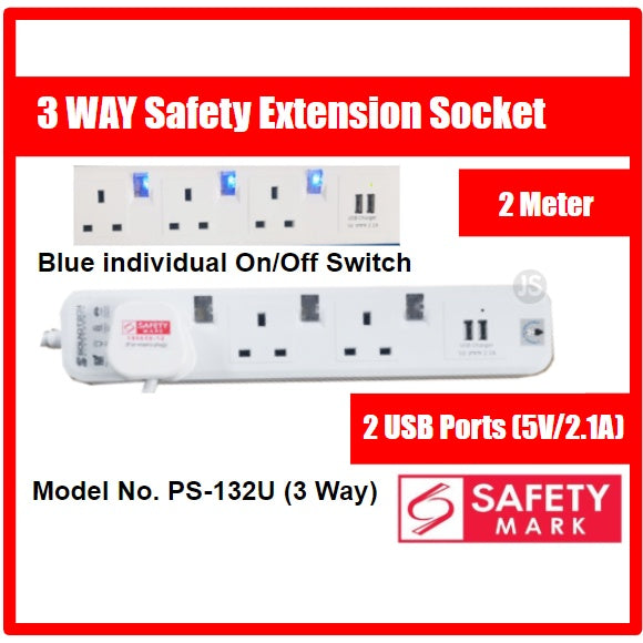 3 & 4 Way Extension Socket with 2 USB Ports (5V/2.1A) & Singapore Safety Mark (2 Meter)
