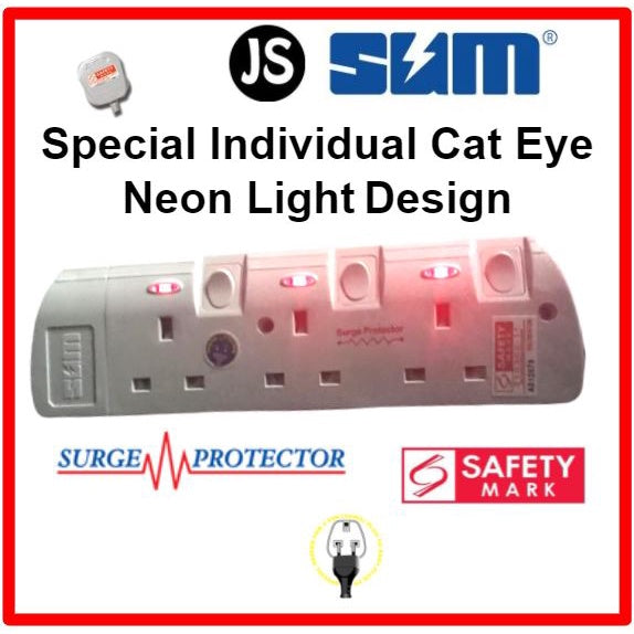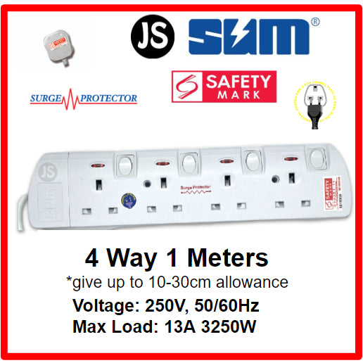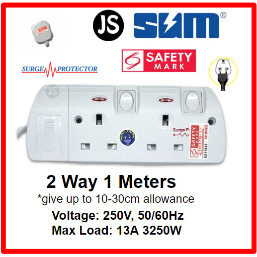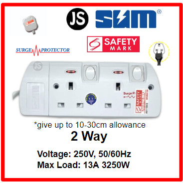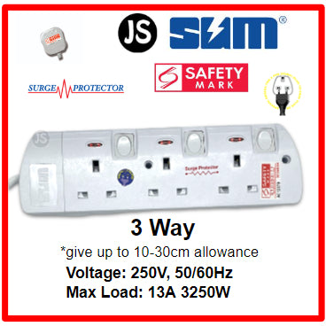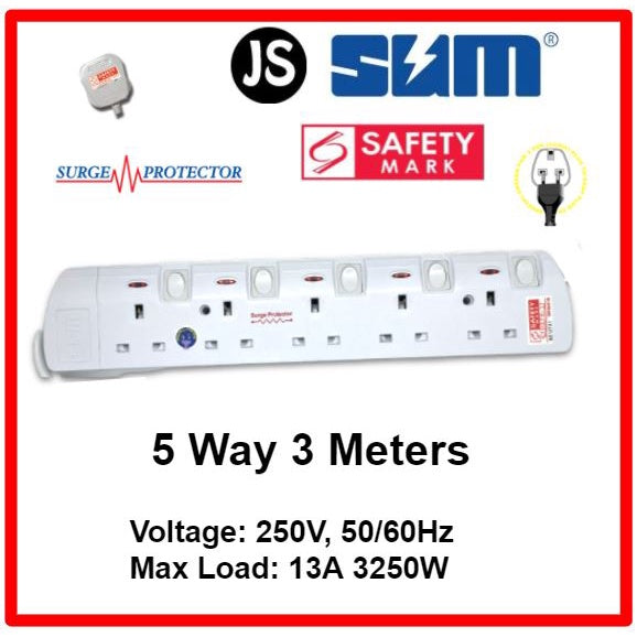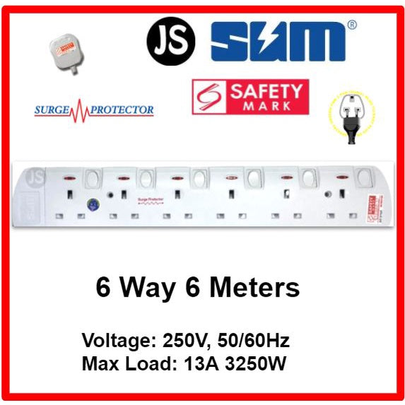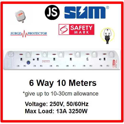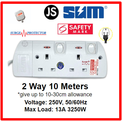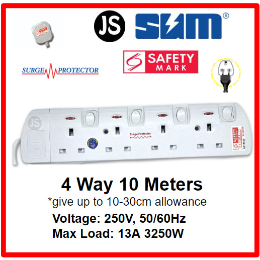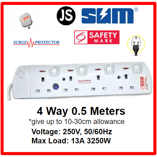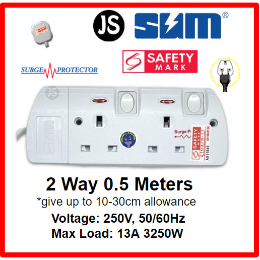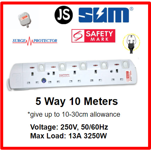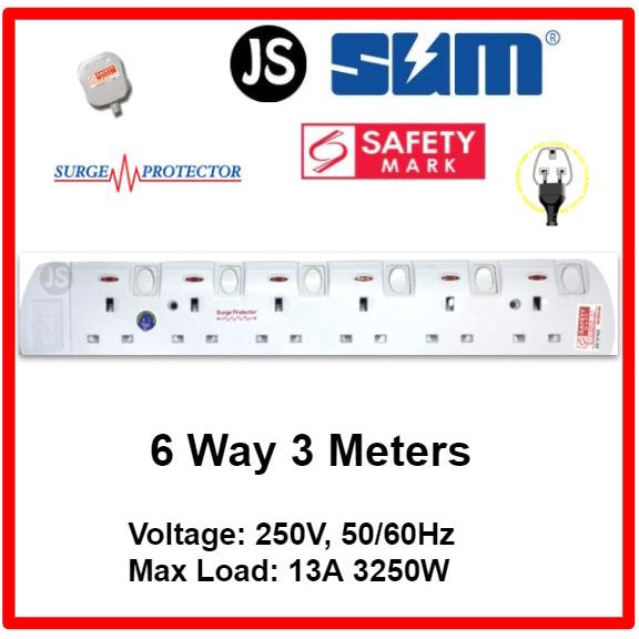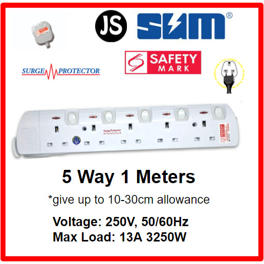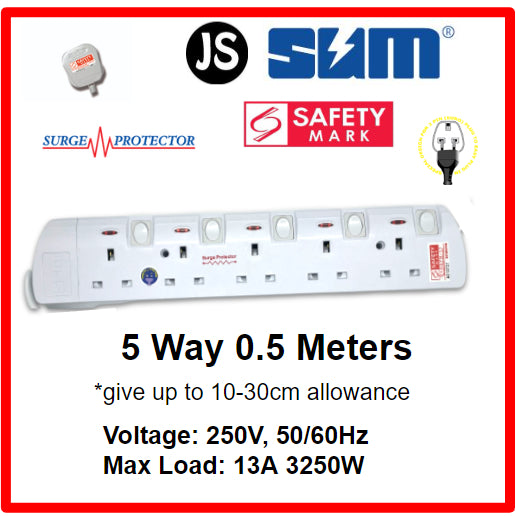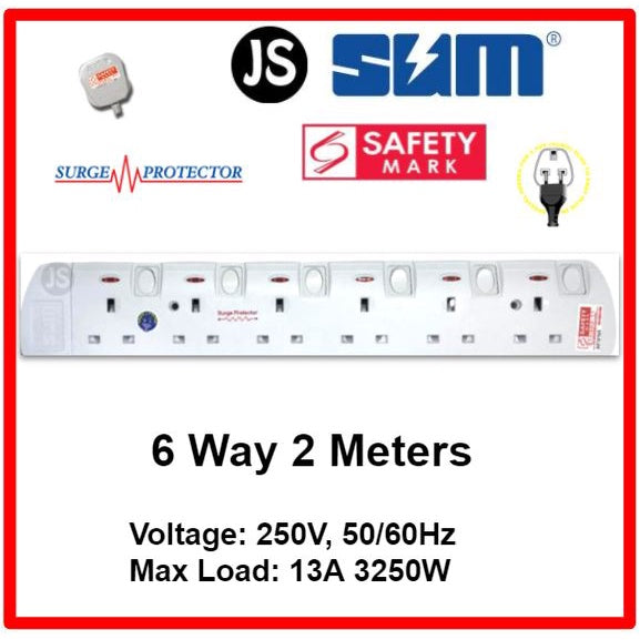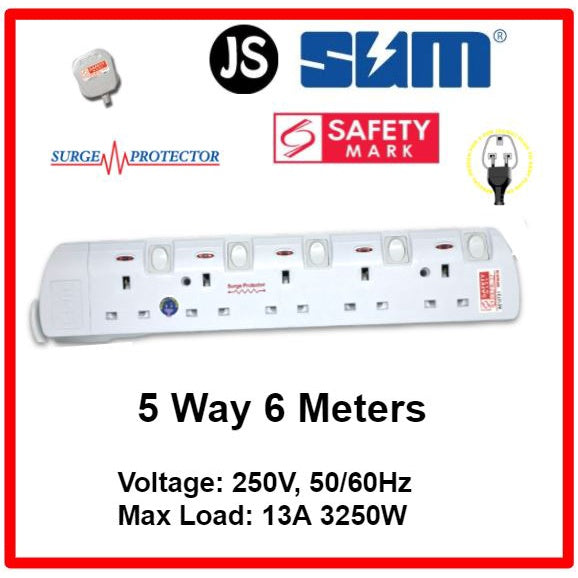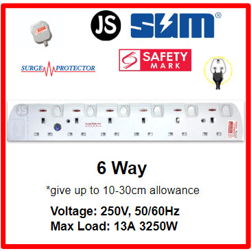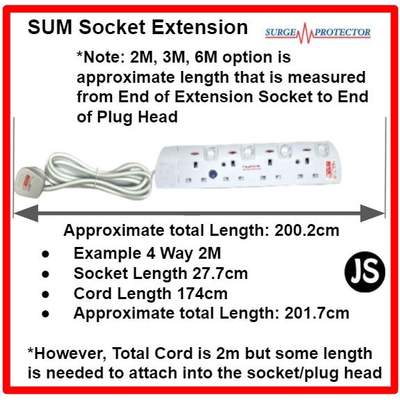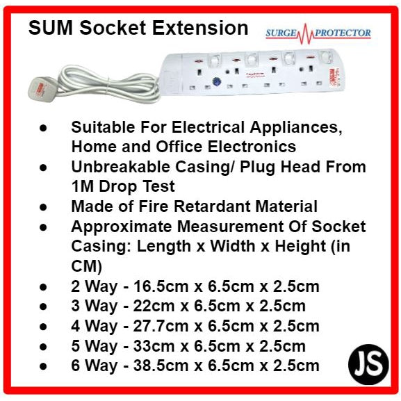 SUM 2/3/4/5/6 WAY Extension Socket (0.5, 1, 2, 3, 6, 10 Meters) with Surge Protector & Safety Mark