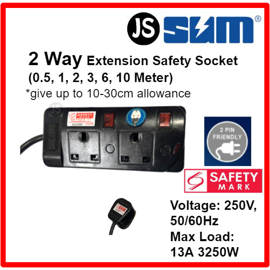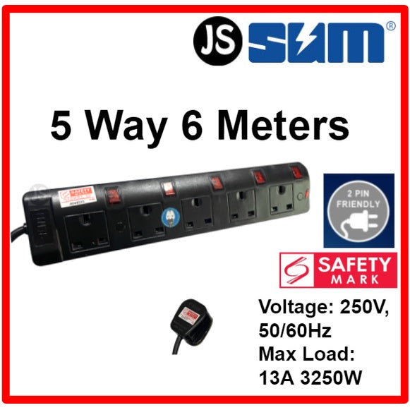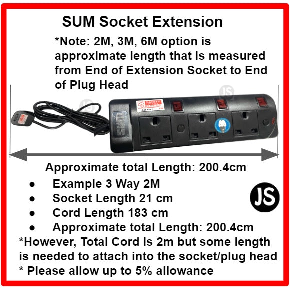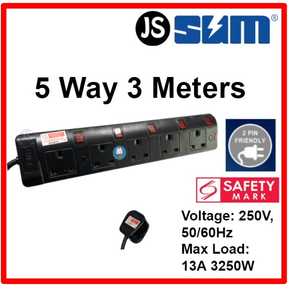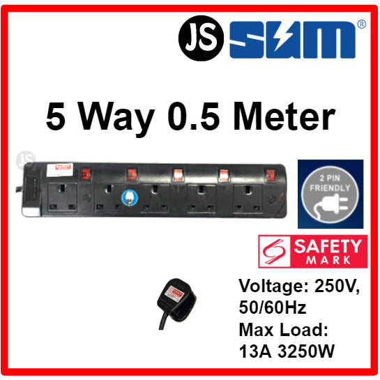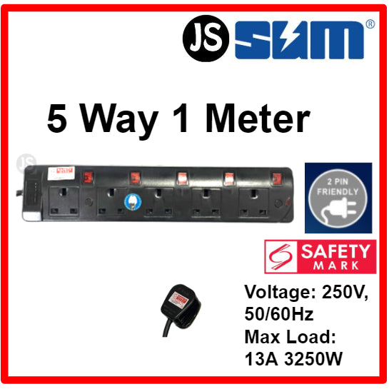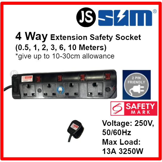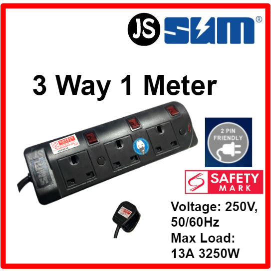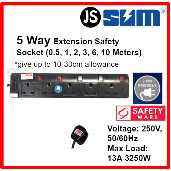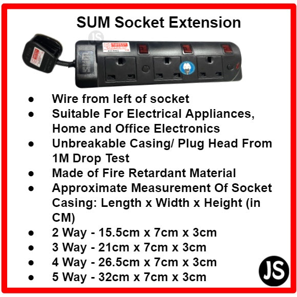 SUM 2/3/4/5 WAY Black Safety Extension Socket (0.5, 1, 2, 3, 6, 10 Meters) Singapore Safety Mark