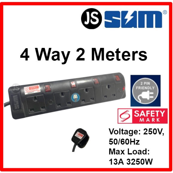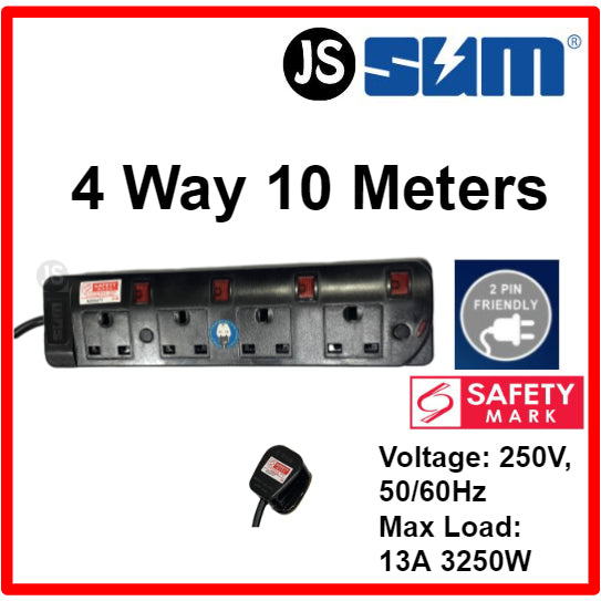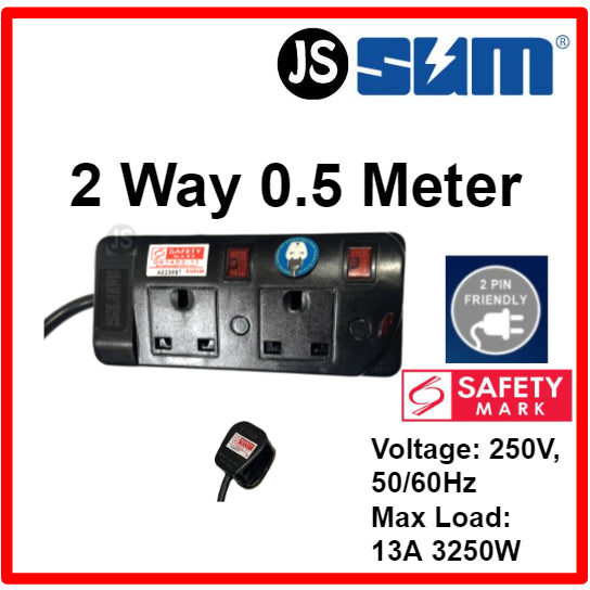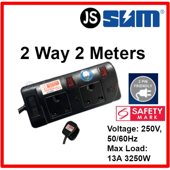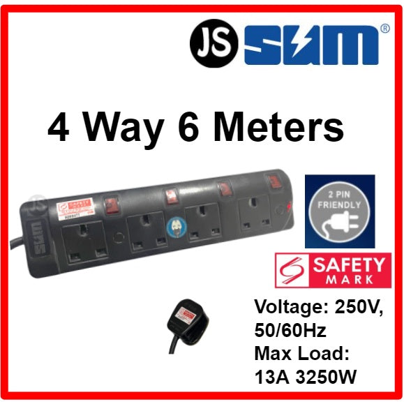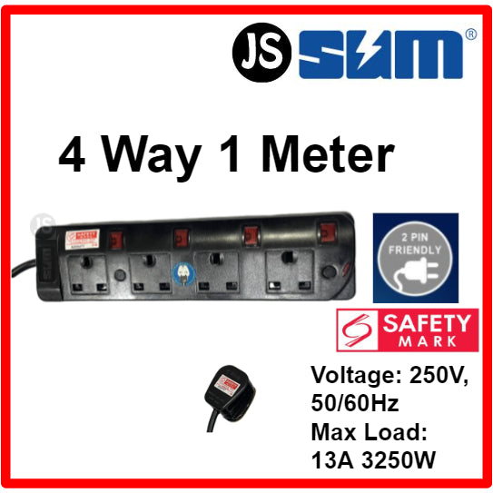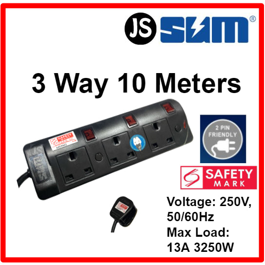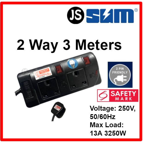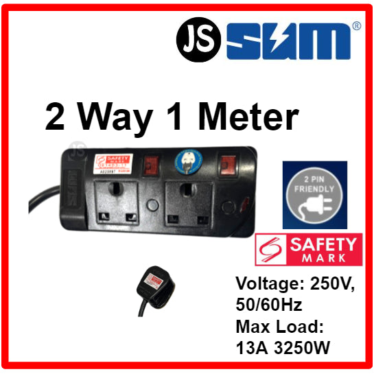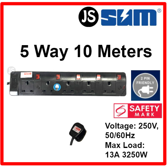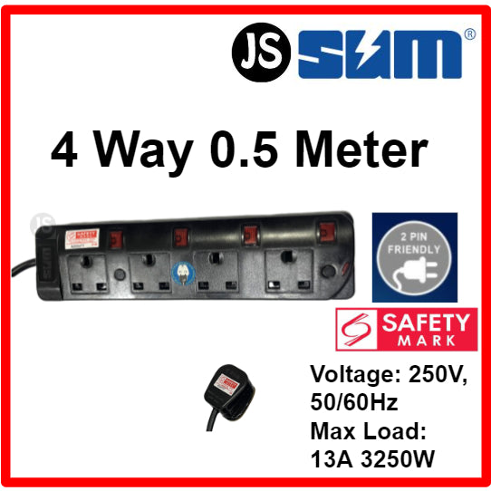 SUM 2/3/4/5 WAY Black Safety Extension Socket (0.5, 1, 2, 3, 6, 10 Meters) Singapore Safety Mark