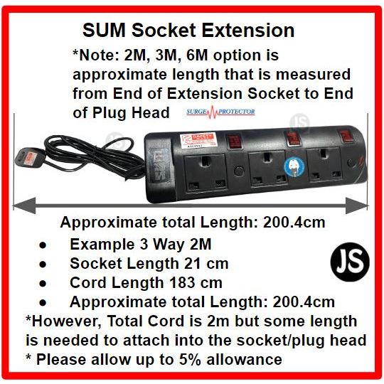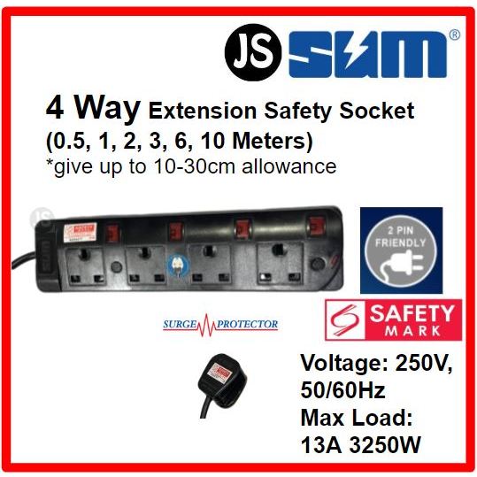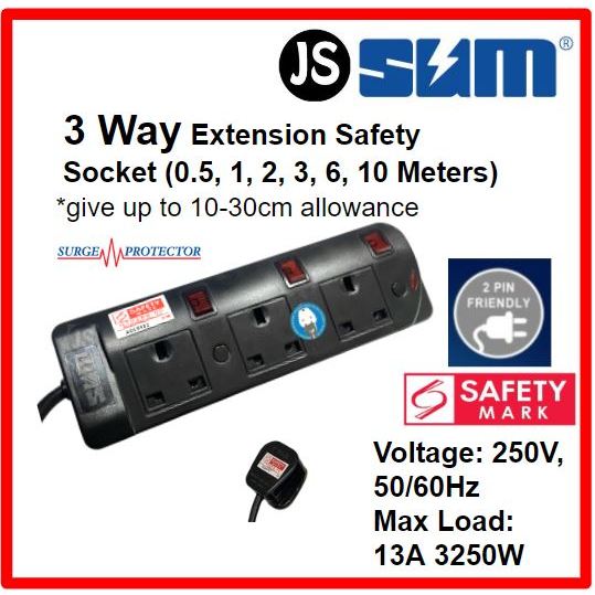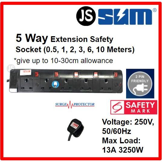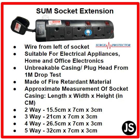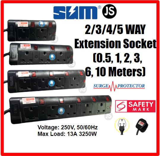 SUM 2/3/4/5 WAY Surge Protector Black Safety Extension Socket (0.5, 1, 2, 3, 6, 10 Meters) Singapore Safety Mark